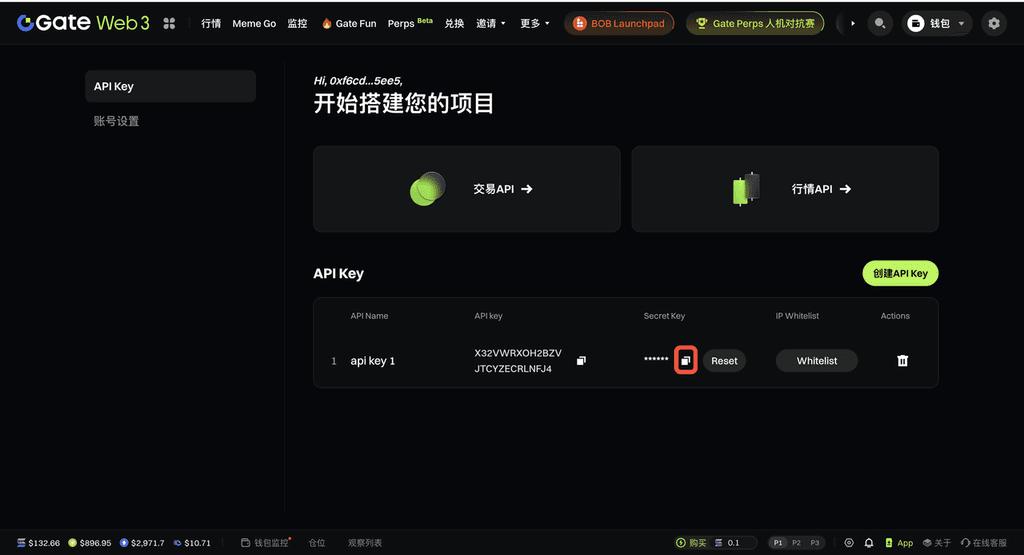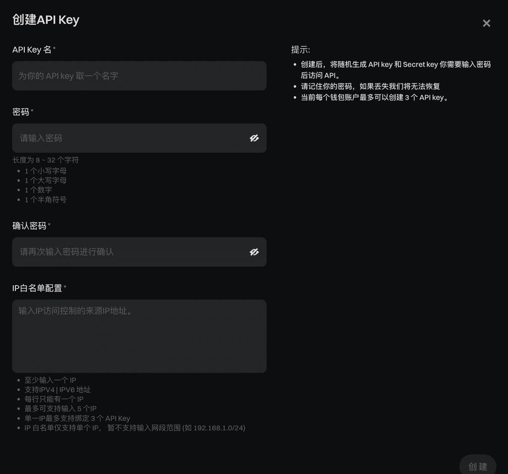 每个账户最多可创建 3 个 API Key。 请妥善保管您的密码和密钥信息——遗失密码将无法恢复 Secret Key。