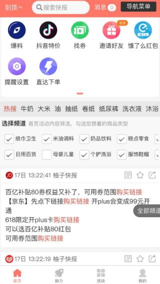 柚子快报app有哪些功能,进入首页,大家就能看到爆料、找券、直达下单等功能模块,在助力板块,则提供微信、京东、淘宝等多个不同的平台助力专区,进入活动板块,则能了解各个平台的最新活动信息,很方便。