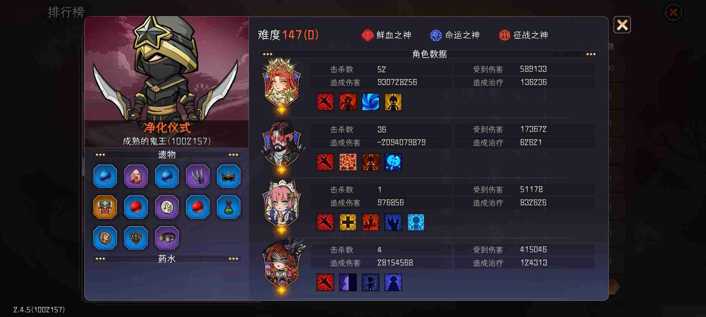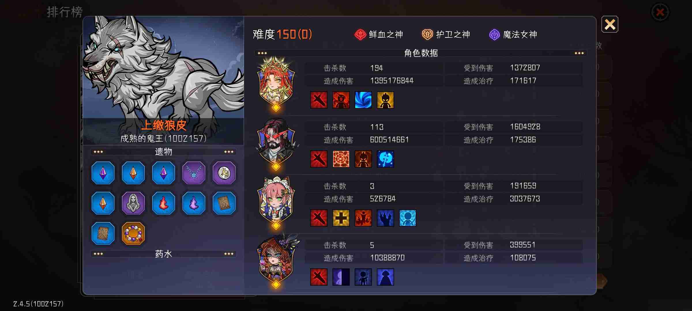 接下来,147乱杀黑星,靠护盾打过150起义军首领,靠西芙项链硬币护卫神艰难砍过150狼王。这三局虽然前期挂机的时间久了点外,但除打boss外,全靠挂机,还算稳定。(一个商店不敢抢)