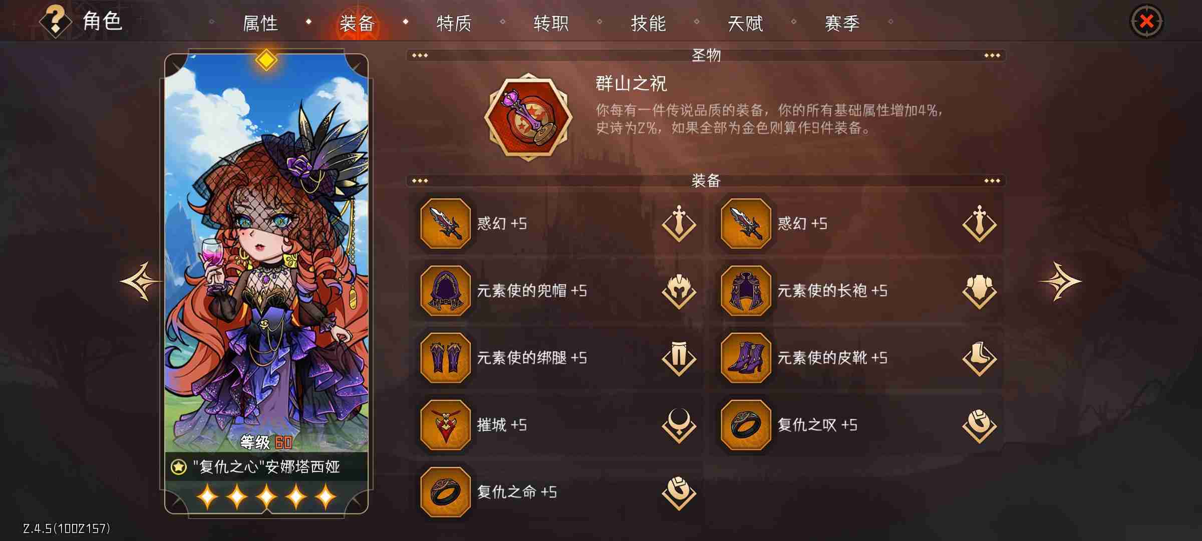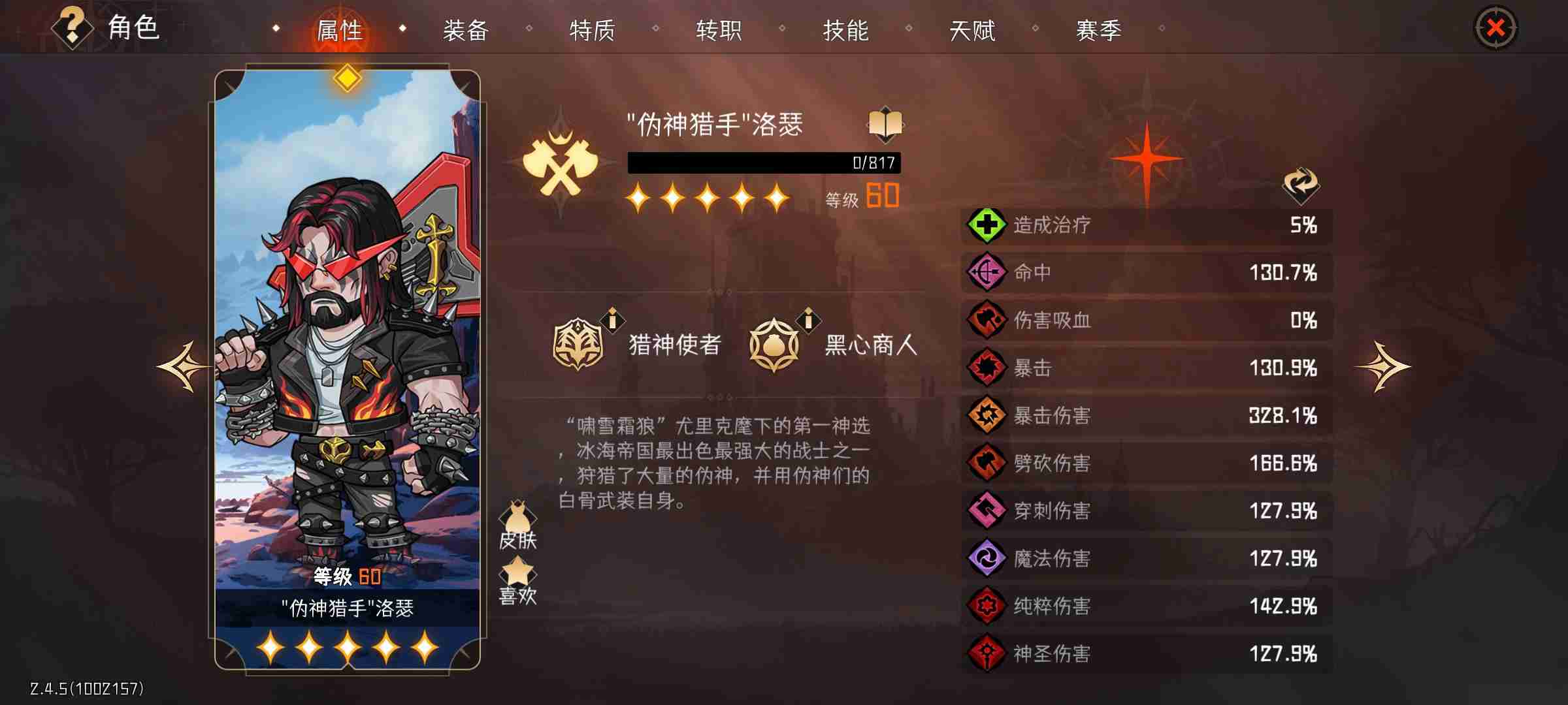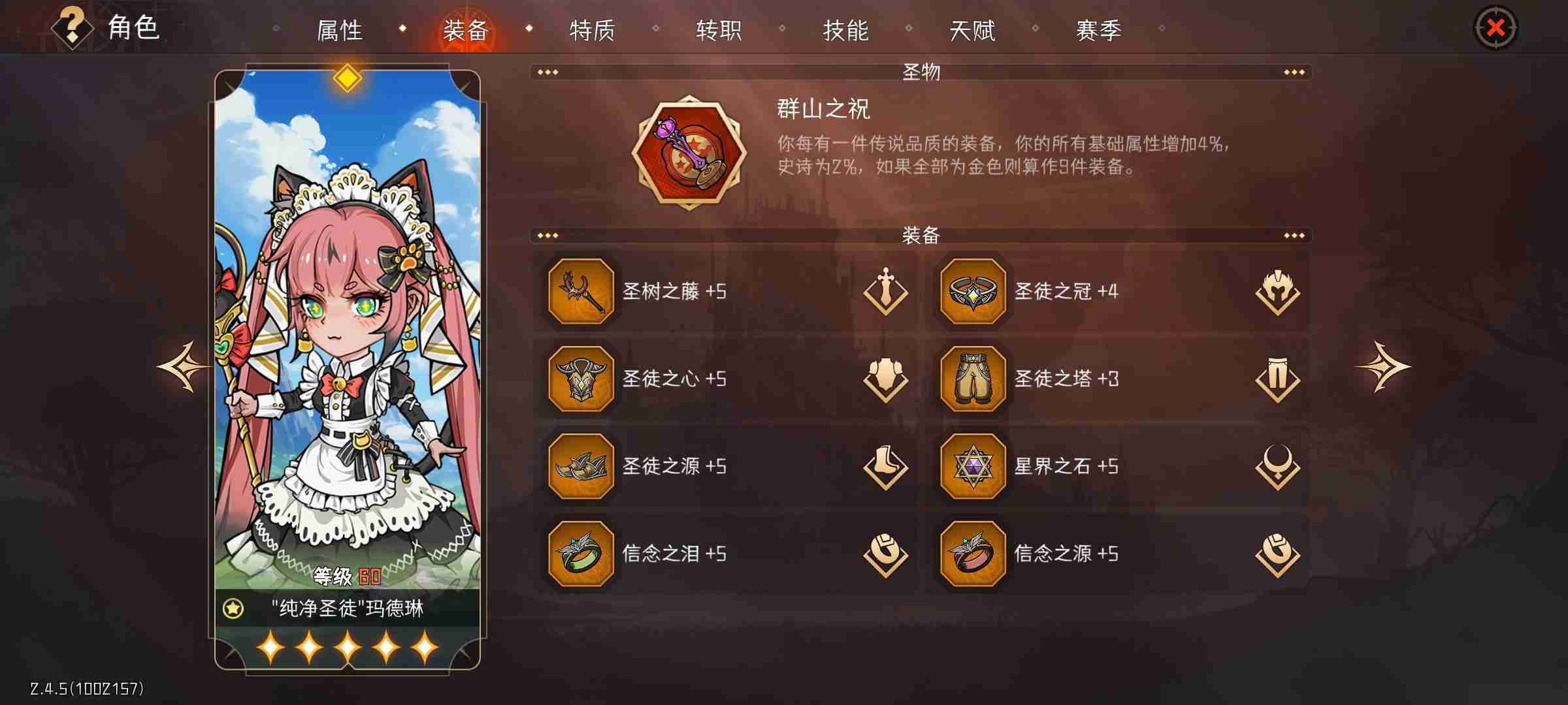 虽然少了一些赛季词条和装备效果,少了32%的命中暴击、20的攻击防御治疗、65X造成伤害、15X受到伤害、坤坤上挑斩降低防御和闪避、鳄鱼的赛季词条降低15劈砍抗性,但多了光牧帝刺双光环的双光环,有控制有净化,感觉还行。