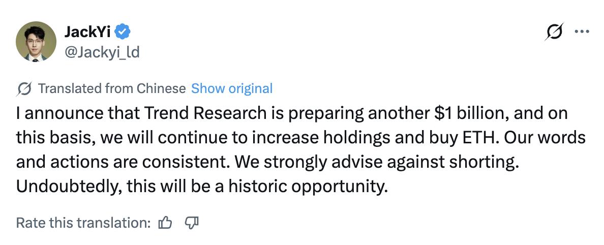 在此基础上,易发布周四,X 表示,Trend Research 正准备向以太坊追加 10 亿美元的投资。此外,他还告诫交易员不要做空以太坊,并重申了该公司长期、以信念为导向的投资策略。