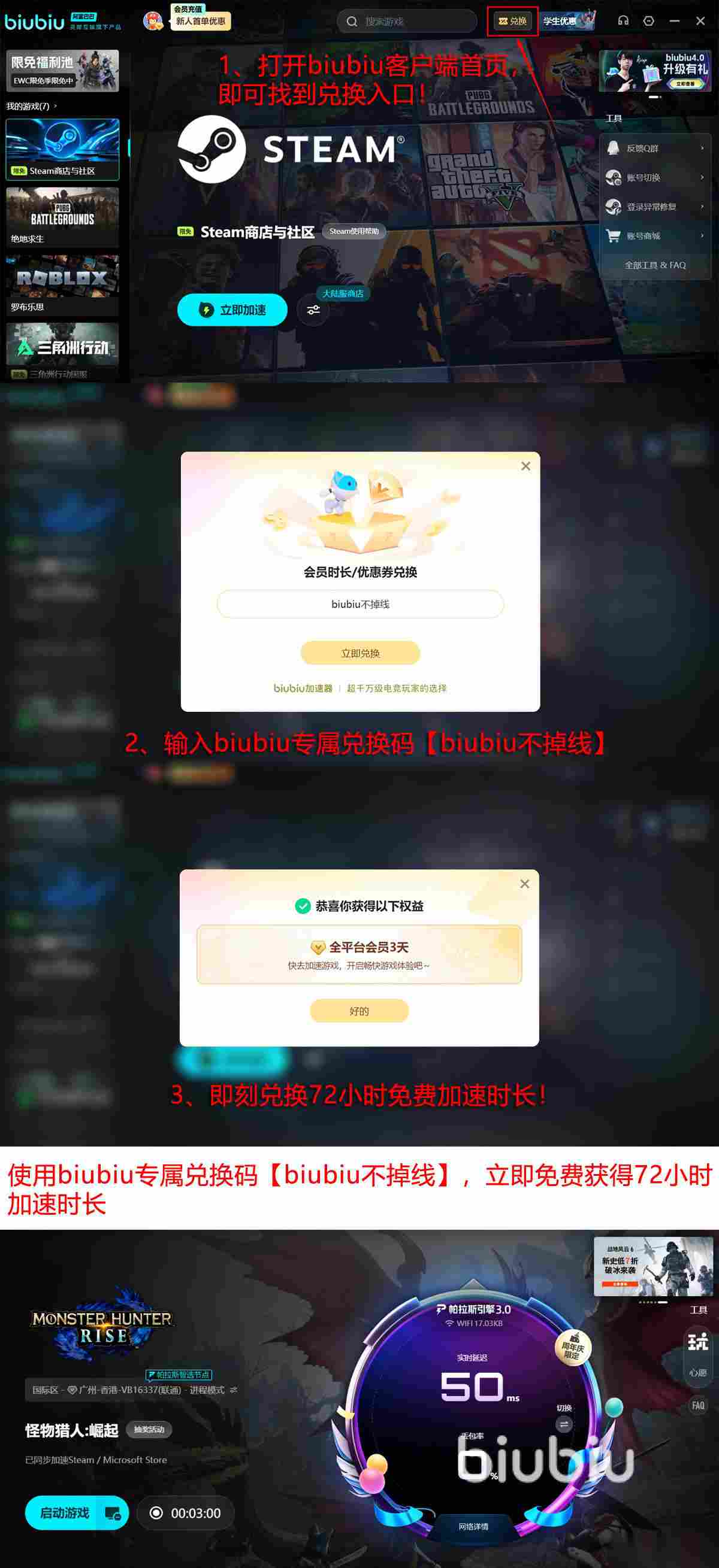 想用到也是赶上了好机会,biubiu当下各种活动同步在开展,先是对steam平台限免加速,其次有扩大限免游戏池,很多打折游戏都能享受到,这个池子活动期是12月18日到1月18日,抓紧参与。最后有大优惠在,新人注册账号即可领24小时免费加速权益的,要是再想多领72h,就要用【biubiu不掉线】来换,新人累积得到的为96h