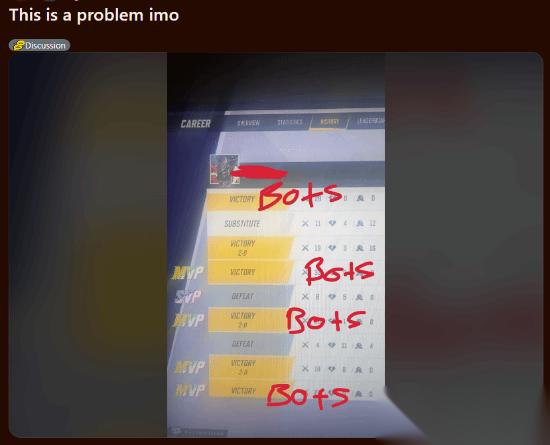 近日,Reddit用户SignalDifference348分享了一张自己的对战记录截图,并逐一标出了他认为对手阵容由机器人组成的比赛。他表示,这已经成为当前游戏中的一个明显问题。