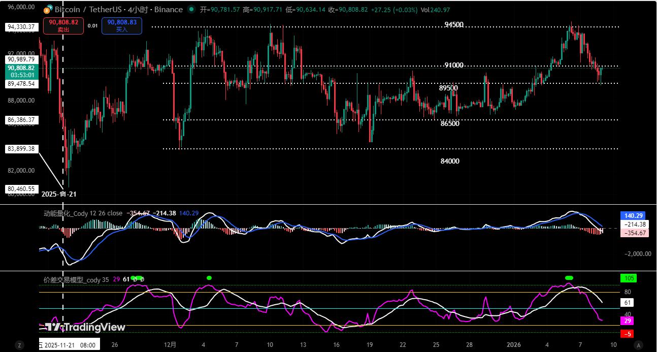 对支撑点位而言,价格在下探至86,000~86,500 美元后出现明显止跌企稳迹象,买盘开始承接,而更下方的84,000 美元关键防线目前尚未被触及,整体结构仍维持在宽幅震荡框架之中。