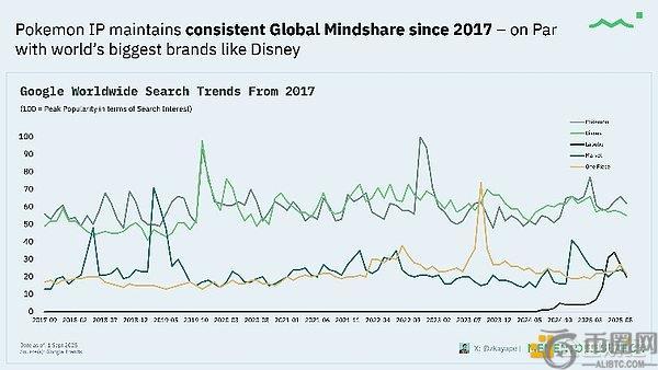 宝可梦持续保持与迪士尼旗鼓相当的全球心智占有率(2017-2025年),表现优于其他热门粉丝向IP(漫威、海贼王及近期大热的Labubu)。