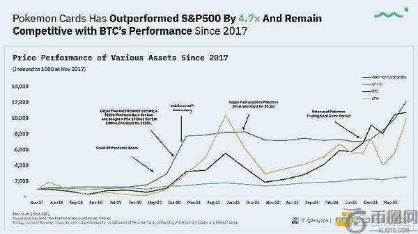 自2017年11月以来,宝可梦卡牌指数跑赢标普500指数约4.7倍,甚至与比特币走势持平——特定事件(Logan Paul炒作事件、新冠疫情危机、25周年纪念)助推了该势头。