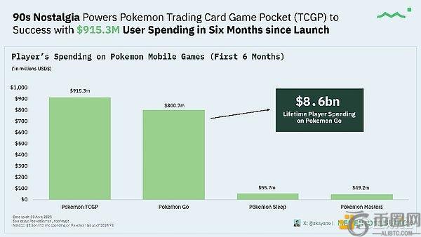 Pokémon TCG Pocket(TCGP)在6个月内产生了约9.153亿美元收益,显著超越其他宝可梦移动端产品,而 Pokémon GO 的终身消费额(86亿美元)印证了该IP的付费基础。这展现出卡包开盒的巨大付费漏斗,以及gacha机制如何成为赚钱机器。
