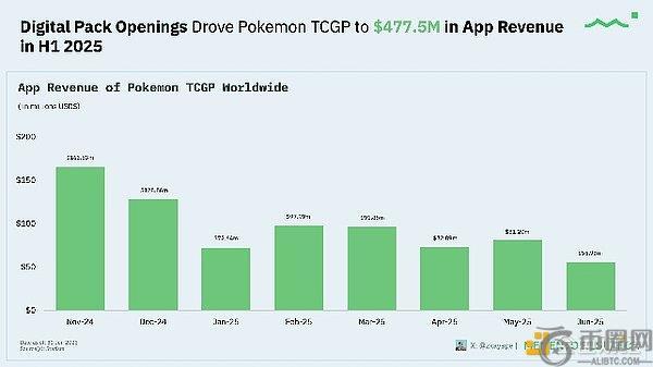 2025年上半年4.775亿美元的应用收入(周期初期即表现强劲)展现出数字卡包开盒助推的"新作爆发效应"。与Labubu现象类似,这证实了盲盒经济模式的持续吸引力——gacha平台用实体卡牌复刻了相同行为模式。