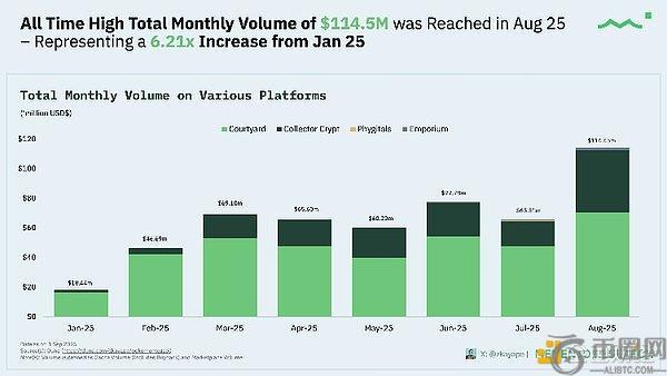卡牌代币化交易板块月交易量在2025年8月达到约1.145亿美元的历史峰值,较2025年1月增长约6.2倍——该数据覆盖四大主导平台:Courtyard(Polygon)、Collector Crypt、Phygitals及Emporium(后三者均基于Solana)。
