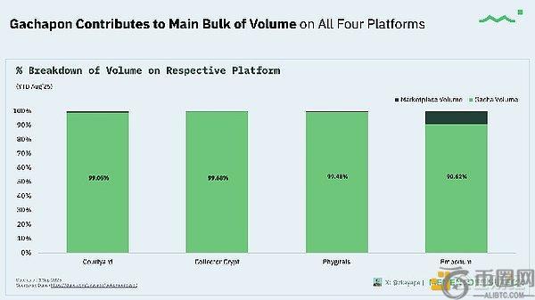 数据明确显示,Gacha机制是主导驱动力(约占四大平台总交易量的90-99%),这准确揭示了大部分收入的实际(卡包利润、手续费及回购收益),而非二级市场点对点交易。