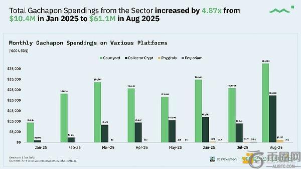 Gacha消费额从约1040万美元(1月)扩张至约6110万美元(8月),增幅约4.9倍。与传统卡牌游戏平台近期繁荣趋势一致,这些链上平台已找到产品市场契合度。更值得注意的是,用户消费增速已超越市场交易量增速,这意味着用户对回购/申领循环模式接受度良好。