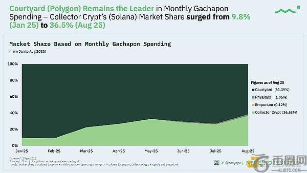 就市场份额而言,Courtyard保持领先地位,但Collector Crypt份额从约9.8%(1月)急剧上升至约36.5%(8月);Courtyard约占61.4%;Phygitals约占2%;Emporium约占0.1%。