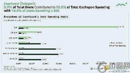 就Courtyard而言,从消费模式可以看出74.5%的用户消费金额≤50美元,而仅约5.9%的用户贡献了约90.5%的gacha总支出。这是典型的鲸鱼经济模式。