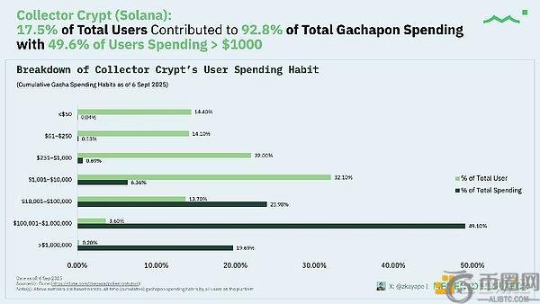 Collector Crypt数据显示17.5%的用户驱动约92.8%的消费额,其中约49.6%用户消费超1000美元。其消费分布较Courtyard更为深度化,偏向"实力收藏家"群体。定价策略、回购速度和系列策划应反映更高的风险承受能力。