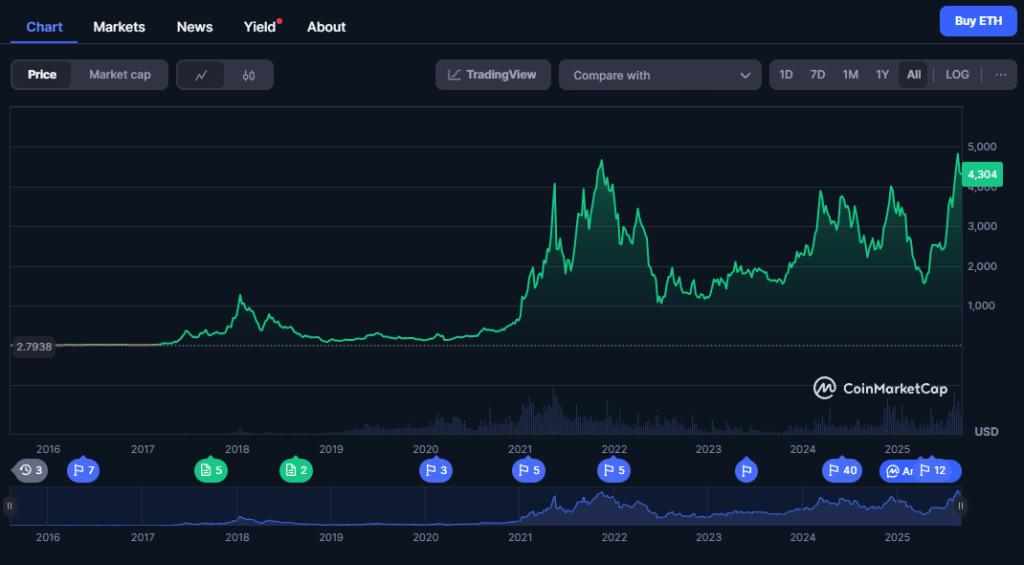 ETH 经历了令人震惊的上涨、痛苦的崩盘以及持续的创新,它在投资者的投资组合中占据着举足轻重的地位。如果你能承受波动,ETH 或许仍有上涨空间。