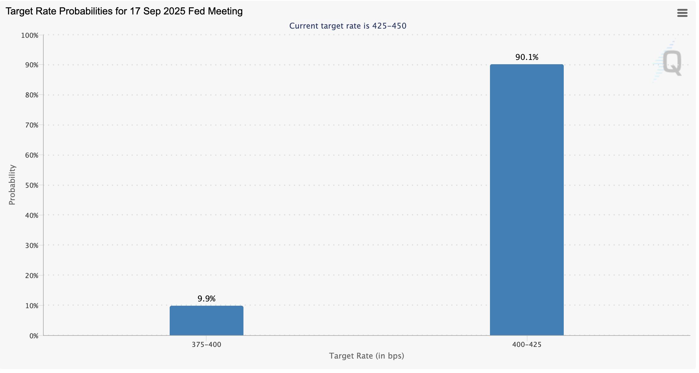 根据 CME FedWatch 工具,美联储降息 25 个基点至 4% 至 4.25% 区间的可能性为 90.1%,这对加密货币和股票.