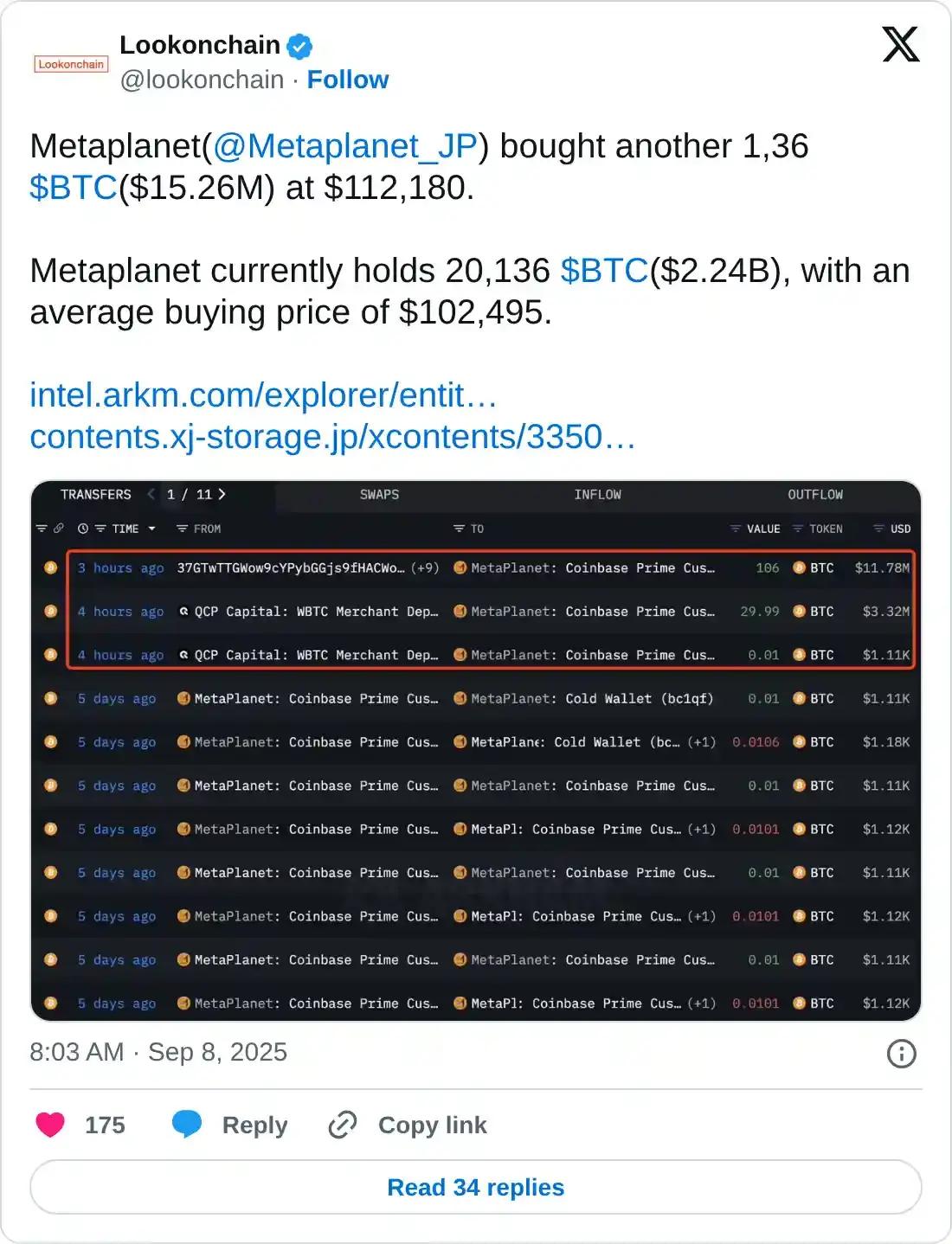 日本的 planet继续增持比特币,周一增持了136枚比特币,价值约1526万美元。 planet (3350)目前持有20,136枚比特币,价值22.4亿美元,平均成本为102,495美元。它是继Bullish (BLSH)、比特币标准财政公司(BSTR)、XXI (CEP)和Strategy (MSTR)之后第五大比特币持有者。