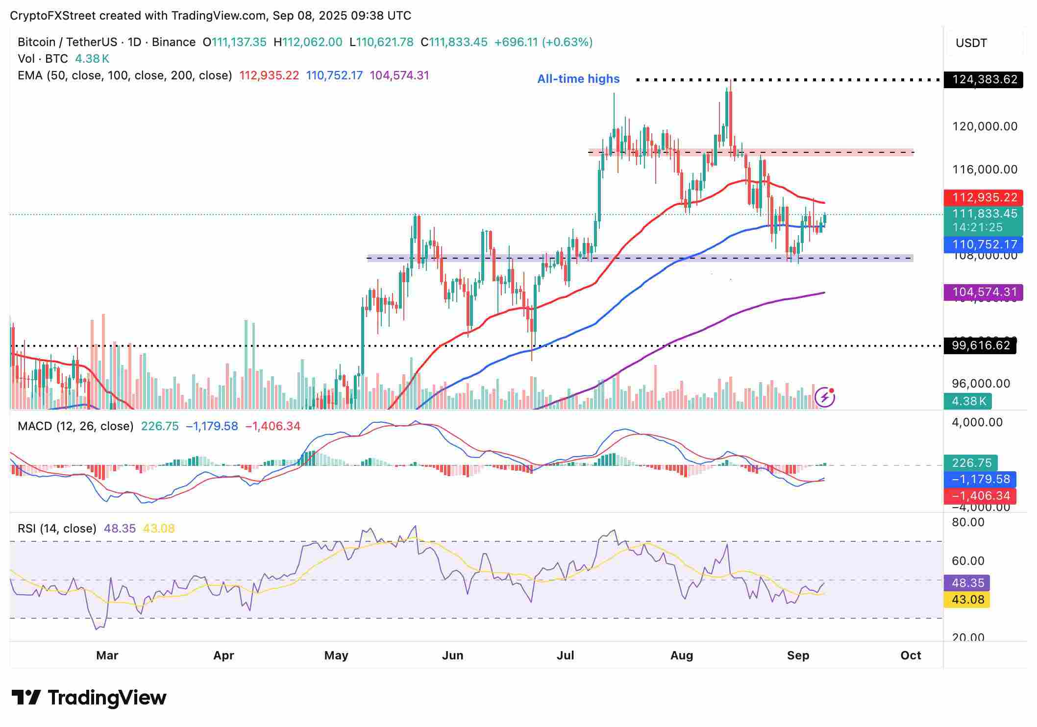 截至周一撰写本文时,比特币徘徊在 111,000 美元的短期支撑位上方,多头再次尝试将涨势延续至 118,000 美元的中期阻力位。