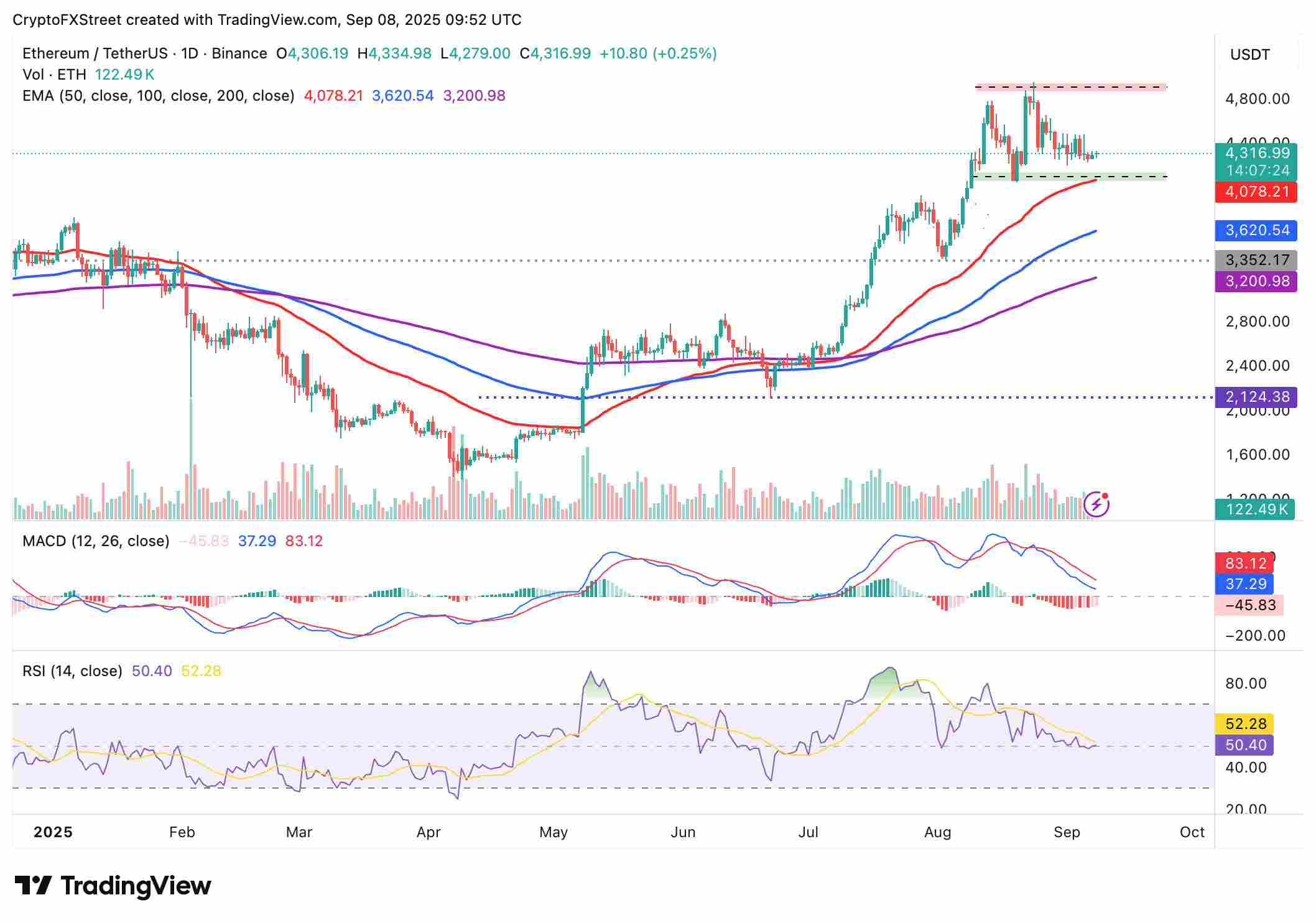 以太坊的交易价格在支撑位 4,078 美元左右和阻力位(8 月 24 日创下的历史高点 4,956 美元)之间相对横盘整理。智能合约代币也维持在关键的上行移动平均线之上,包括 50 天 EMA(4,078 美元)、100 天 EMA(3,620 美元)和 200 天 EMA(3,200 美元),这支撑了潜在的看涨结果。