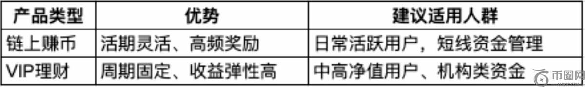 产品类型优势建议适用人群链上赚币活期灵活、高频奖励日常活跃用户,短线资金管理VIP理财周期固定、收益弹性高中高净值用户、机构类资金