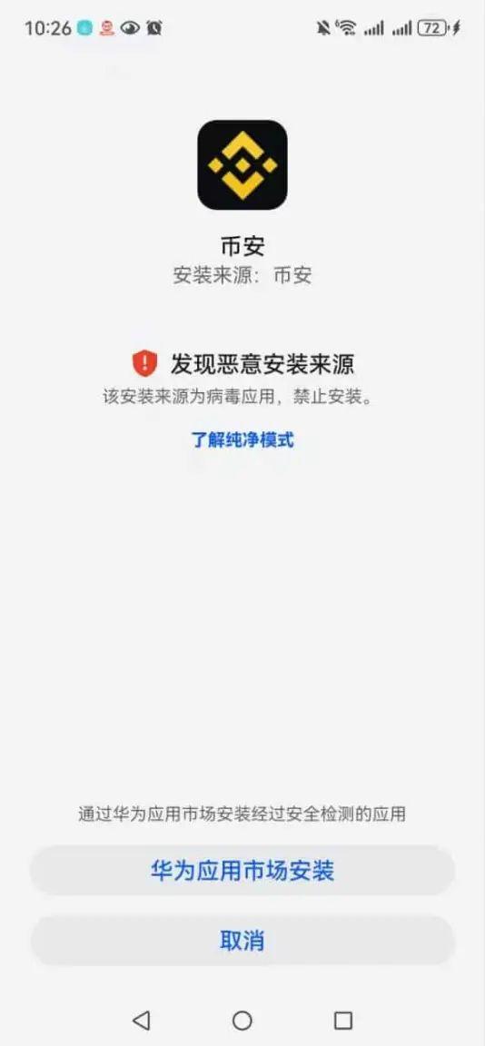 安装币安时,华为手机显示其为病毒