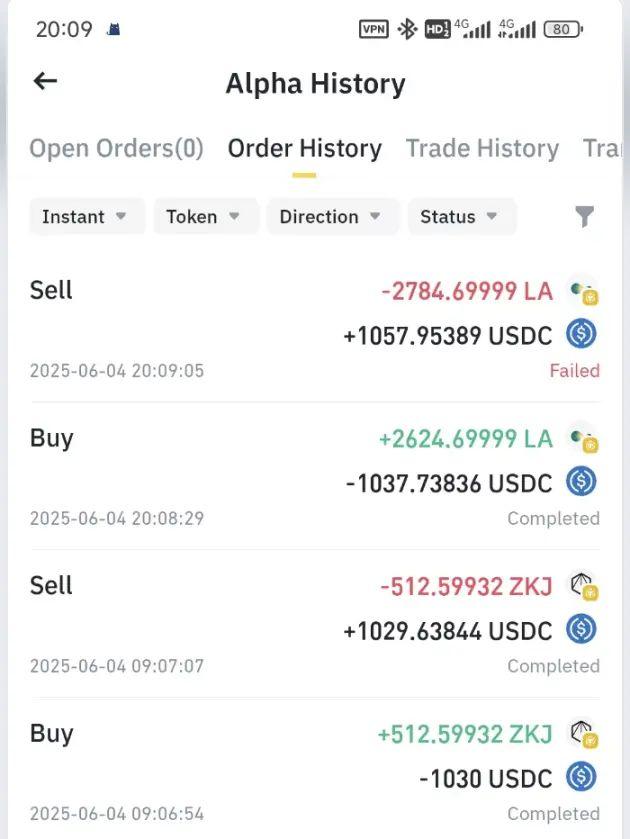 不过定睛一看,最上面的卖出操作还失败了。脑海里迅速回顾了多个 Alpha 代币上线后即瀑布的 K 线图,瞬间冷汗直流。这要是没有及时卖掉,恐怕得亏损几百 u,可真是我图它空投,它图我本金啊!