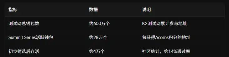 根据社区统计数据,参与 Camp Network 测试网交互的总钱包数高达 600 万个,其中 Summit Series 活跃钱包约为 28 万个,但符合空投资格地址仅有 4 万个