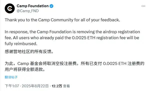 然而,随着社区负面情绪迅速发酵,Camp Network 在当天下午紧急宣布取消空投注册费,并承诺对已支付 0.0025 ETH 的用户全额退款。