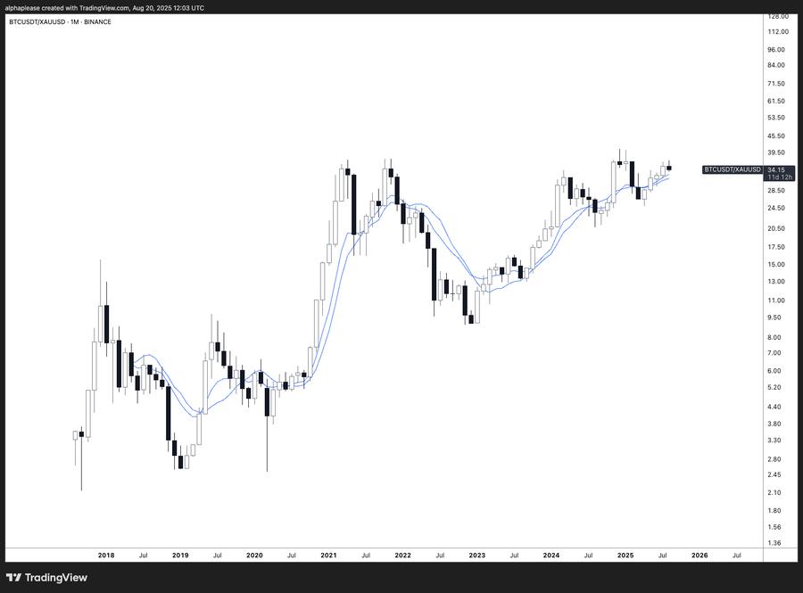•   目前比特币在黄金计价上甚至还未超过上一周期的高点——几乎谈不上泡沫状态。