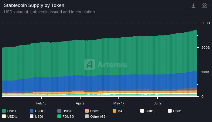 在传统金融(TradFi)中,M2货币供应量的增长通常先于资产泡沫的形成。而在加密领域,稳定币市值扮演着类似的角色,代表加密生态系统内可用的总“美元”供应量。