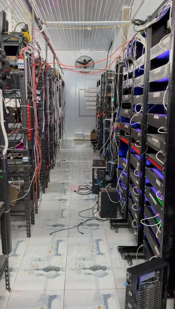 铁皮棚内部摆满了金属架,每个架子上密密麻麻地放着上千部智能手机,只留下狭窄的通道供员工通行。整个布局看起来就像是一家 “山寨” 加密矿场。