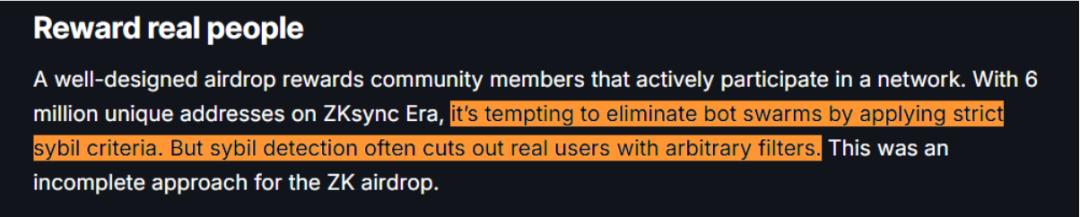 ZKsync 在其官方 FAQ 中回应称,当前的女巫攻击策略日益复杂,已经很难与真实用户区分开来;而如果采取过于严格的筛选标准,虽然能拦下一部分女巫攻击者,但也可能会误伤大量真实用户。