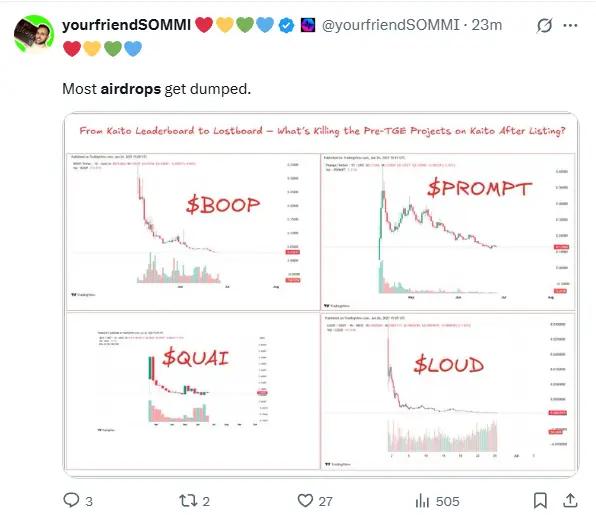 这类 “薅空投” 的做法往往导致农场用户在领取代币后立即抛售,冲击市场价格,同时也使得真正的真实用户更难获得空投。许多项目在空投前会出现大量虚假活跃行为,而一旦空投发放完成,用户数量和代币价格往往迅速下跌。