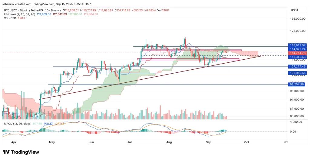 比特币价格在两个主要区间波动,一个是116,200美元至116,700美元之间的重要阻力位,另一个是111,600美元至110,800美元之间的支撑位。自8月以来,比特币价格第二次未能突破阻力位,这证实了空头的强劲存在。此外,技术面并未发出强烈的看涨信号,因此看跌情绪可能持续。