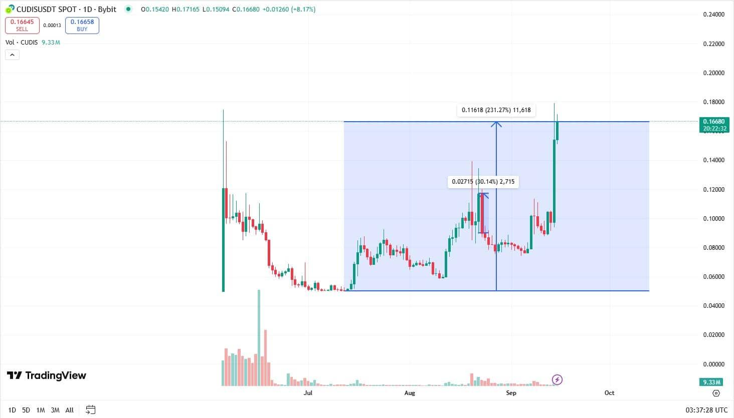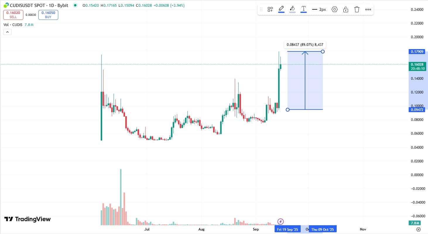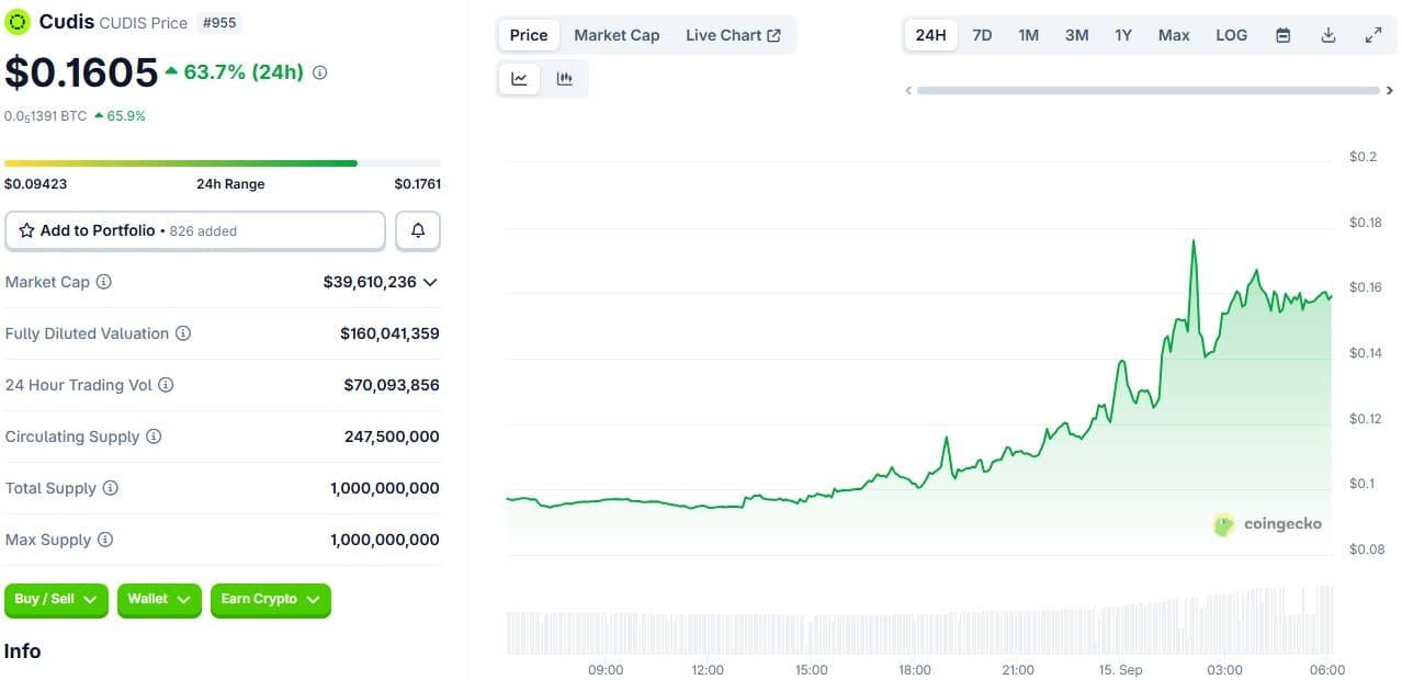 CUDIS 加密货币在 24 小时内暴涨近 60%,在 Coinbase 新上市后攀升至 0.179 美元,引发了大量零售和机构需求。