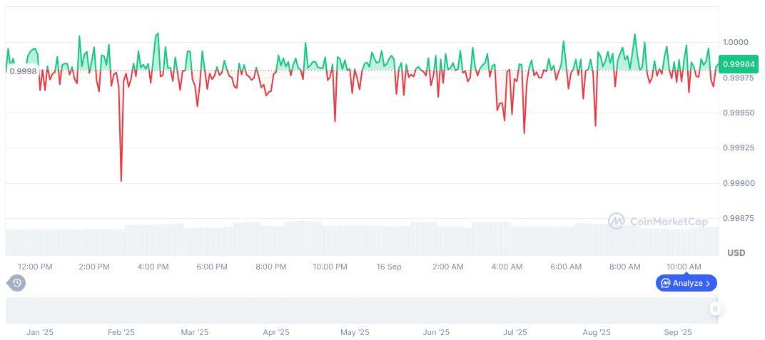 瑞波币美元 (RLUSD) 日线图,CoinMarketCap 截图,UTC 时间 2025 年 9 月 16 日 11:05。CoinMarketCap