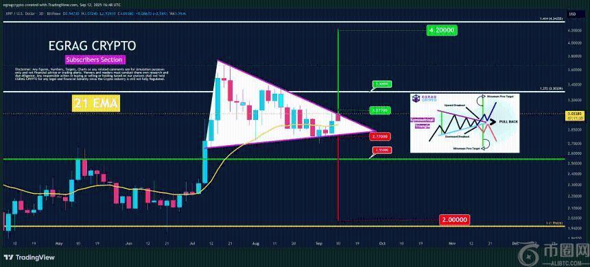 另一位分析师EGRAG CRYPTO也表达了类似观点,他认为XRP的下一个阻力位在3.3美元。如果突破该水平,其下一个目标可能是4.2美元。