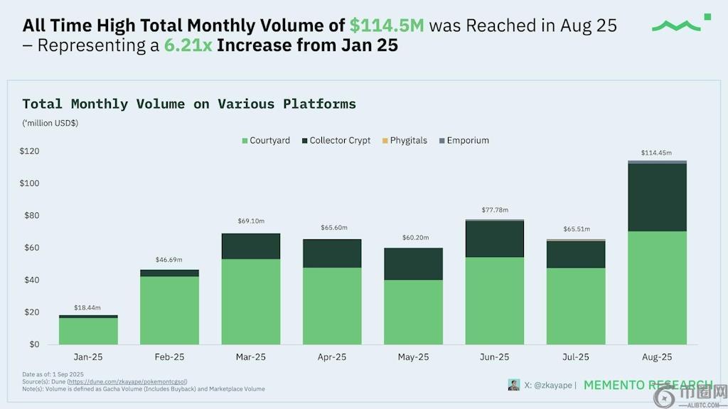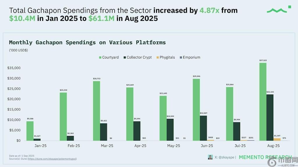 过去几个月,类似扭蛋机的平台产品与市场的契合度不断提升。据数据显示,Courtyard、Collector Crypt、Phygitals 和 Emporium 等平台的总支出从 1 月份的 1040 万美元增长至 8 月份的 6110 万美元。纪念研究.