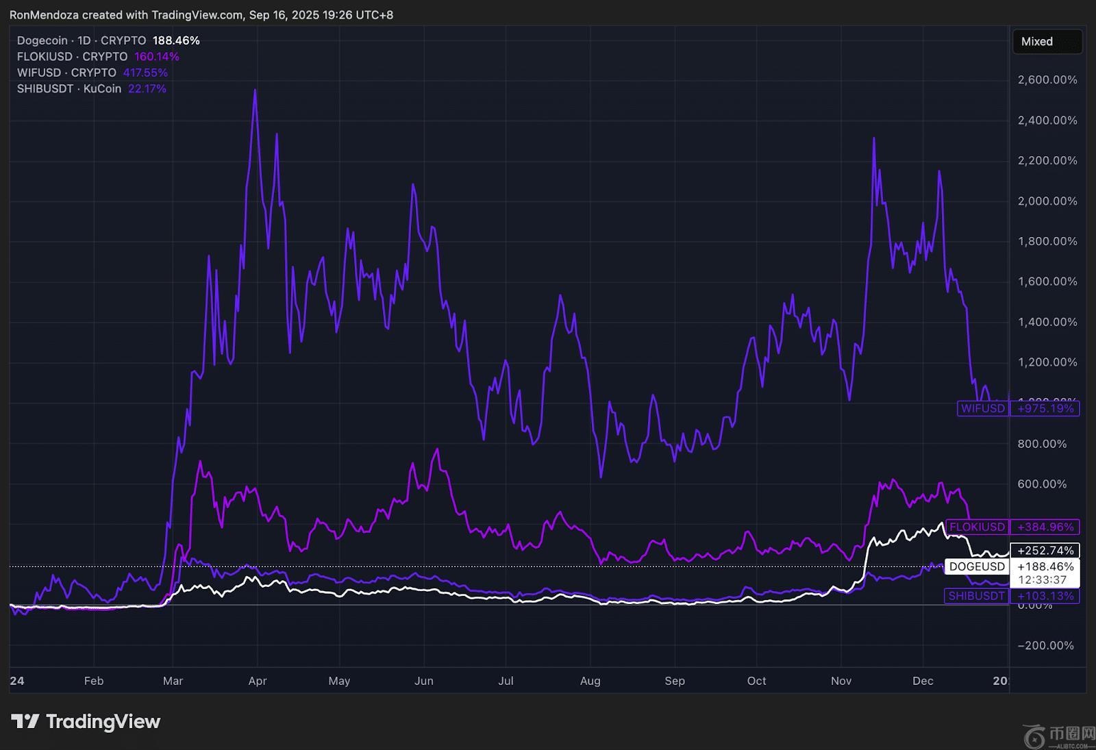 去年发生了许多人称之为“模因币超级周期”的事件,其余波将持续到2025年。然而,新晋代币的表现却盖过了狗狗币和SHIB。Floki (FLOKI) 和 DogWifHat (WIF) 等代币抢尽风头,纷纷创下新高,而老牌代币则有所落后。