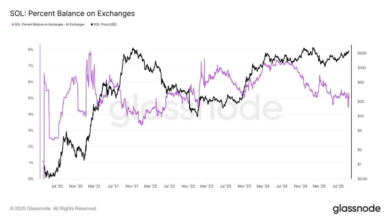 Solana (SOL)正在经历一场巨大的结构性变化,因为交易所的代币供应量已降至多年未见的水平。这种下降意味着抛售压力减小,因为更多的代币被转移到冷藏