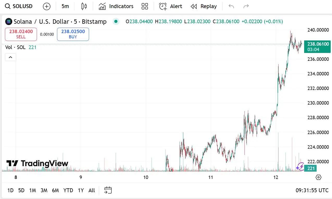 Solana 的当前价格为238.02 美元,过去 24 小时内上涨了 15.24%,市值