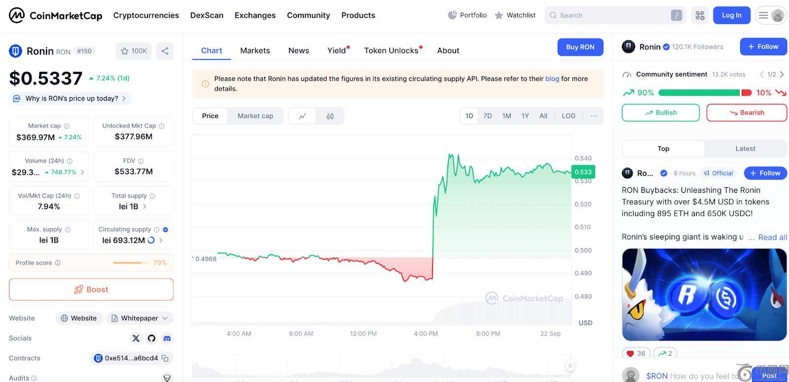 这一消息提振了市场情绪。过去24小时内,RON交易价格接近0.53美元,日交易量突破2900万美元,较之前水平大幅上涨。