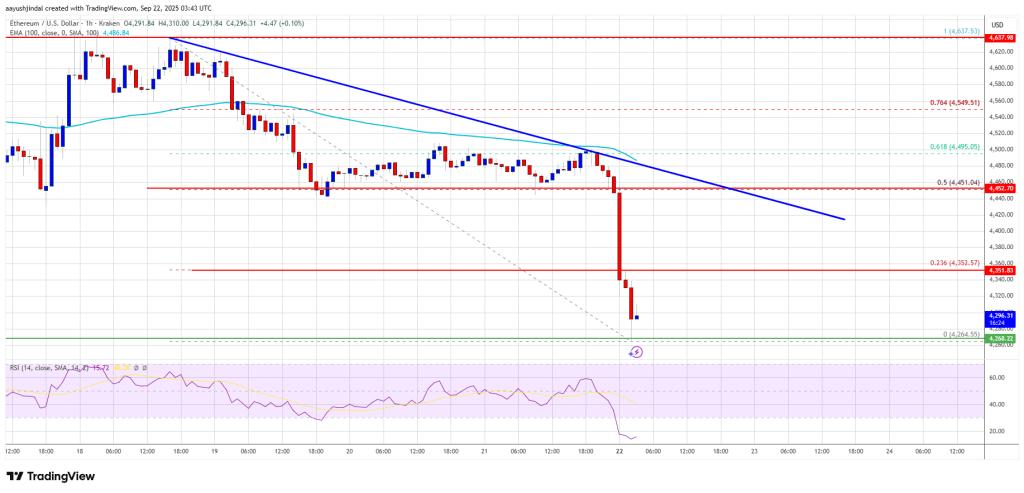 以太坊价格未能继续突破 4,650 美元区域并开始新一轮下跌,例如比特币. ETH 价格跌破 4,600 美元和 4,550 美元的支撑位。