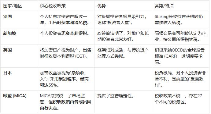 这张表格清晰地揭示了美国所面临的严峻挑战。一位美国的长期比特币投资者,在持有资产超过一年后出售,需要缴纳最高20%的资本利得税;而如果他身在德国,这笔税款为零。这种差异足以让大量资本“用脚投票”,流向法兰克福而非纽约。