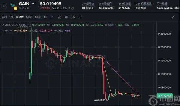 昨日,币安 Alpha 新秀 GriffinAI 在上线仅 12 小时后便遭遇恶性事件,其代币 GAIN 被恶意增发 50 亿枚用于砸盘,导致价格在短短 1 小时内暴跌超过 97%,最低触及 0.004185 美元。截至撰稿时,GAIN 价格徘徊在 0.0195 美元附近。