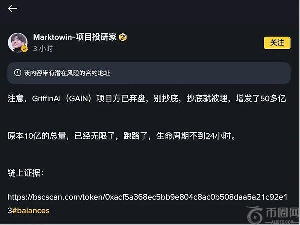 据 Ai 姨监测,一个以 0x951 开头的地址几乎在 GAIN 最低点附近,以均价 0.00625 美元买入 2.02 万美元,1 小时内浮盈高达 10.7 万美元。同一时间,部分社区投资者选择抄底买入,试图从市场反弹中获利。然而,加密领域知名意见领袖「Marktowin」却在币安广场警告称,项目方已弃盘,抄底将面临埋单风险,并预测该项目生命周期可能不足 24 小时。