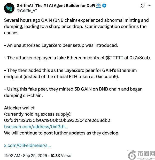 事件发生 4 小时后,GriffinAI 官方发布声明,解释了此次攻击的原因:攻击者引入未经授权的 LayerZero 对等点设置,在以太坊上初始化了一个额外的 LayerZero Peer,并部署了假冒合约 TTTTT(地址 0x7a8caf)。随后,攻击者利用配置错误的 Peer,绕过跨链验证,在 BSC 上铸造了 50 亿枚 GAIN。