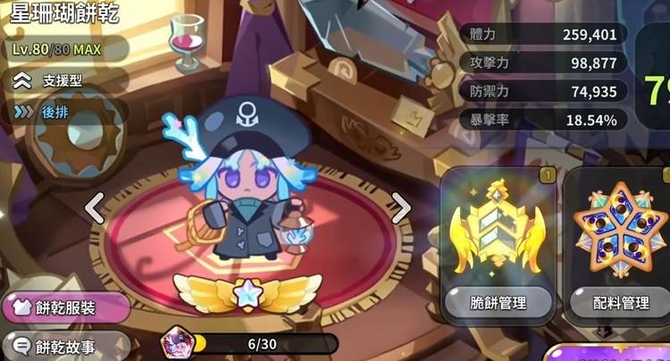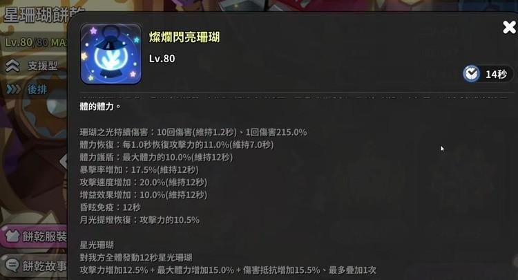 星光珊瑚是增强攻击力、最大体力和伤害抵抗力,所有增益统一持续12秒,没有独立图标,包含在图标中,因此同时加成,同时消失。在配料方面,更适合特殊的月光配料。建议优先选择冷却配料,提高技能循环效率,脆饼属性主要是冷却和爆炸率,更适合队友有薄荷饼干、新鲜奶油貂饼干、烤布蕾饼干等。