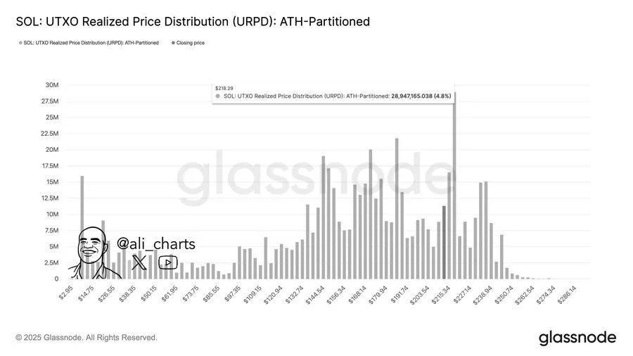 市场分析师阿里·马丁内斯 (Ali Martinez) 强调,218 美元是 Solana 的主要供应壁垒。UT十O 实际价格分布 (URPD) 图表显示,在该水平附近,近 2900 万 SOL 被收购,占总供应量的 4.8%。这种集中度导致大量潜在卖家寻求盈亏平衡,如果价格接近 218 美元,可能会引发获利回吐。