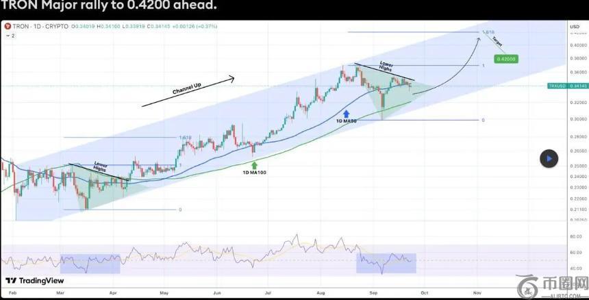 TRX 当前价格为0.336美元,并已突破上升三角形态,显示出强劲的看涨信号。分析师预计,若买盘持续,目标价可能达到0.4200美元。